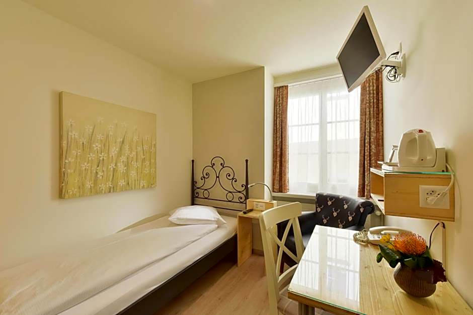 This double room faces the quiet alley. It features a boxspring bed, seating area, flat-screen TV, desk, telephone and tea and coffee facilities. The small bathroom is fitted with a shower and WC.